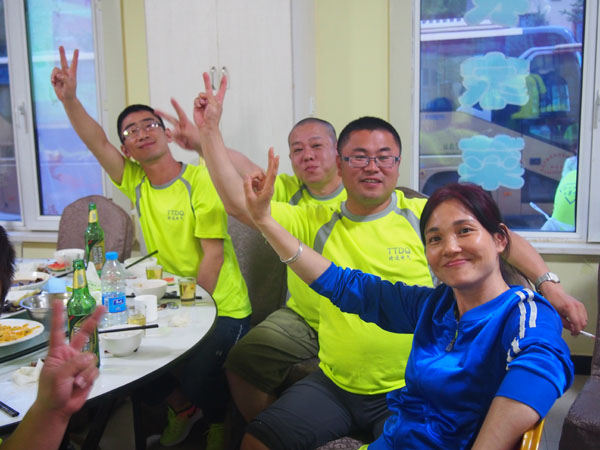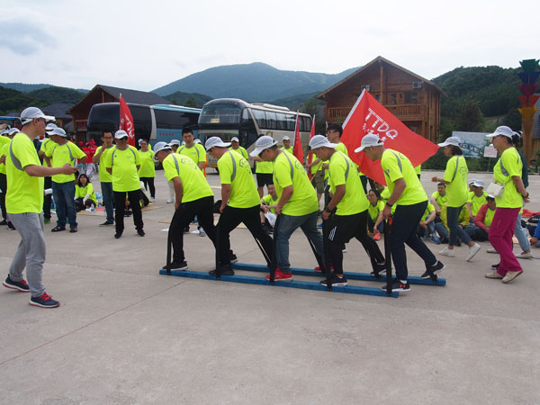 14日清晨,“微風(fēng)與腳步同行,陽(yáng)光共笑容一色”,亞布力鍋盔山我們來了,急切要投入青山綠水的懷抱,三個(gè)小時(shí)的車程,到了目的地大家下車首先看到的就是驚喜,我們住的是林區(qū)的木制別墅,房間里充滿了樹木的清香。大家放下包來到飯店,中午公司給大家準(zhǔn)備了可口的飯菜,大家不知是餓了還是農(nóng)家綠色菜肴的美味,吃得個(gè)快活逍遙。大家快速吃完飯就來到了拓展訓(xùn)練場(chǎng)地集結(jié)。