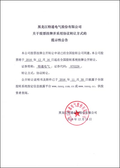 黑龍江特通電氣股份有限公司于2016年12月16日在全國中小企業(yè)股份轉(zhuǎn)讓系統(tǒng)(新三板)掛牌公開轉(zhuǎn)讓,證券簡稱:特通電氣,證券代碼:870229。特通電氣在全國中小企業(yè)股份轉(zhuǎn)讓系統(tǒng)成功掛牌,標(biāo)志著公司正式進(jìn)入資本市場,開啟了公司發(fā)展的新篇章。